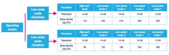 LIS2DW12TR 支持12-14位輸出,可以設成低功耗或低噪聲優(yōu)先模式,每個模式有五種設置,配合每個模式的五種設置,可以節(jié)省喚醒系統(tǒng)檢查數(shù)據(jù)所需時間,實現(xiàn)高效的單字節(jié)傳輸,從而最大限度降低系統(tǒng)功耗,延長電池續(xù)航時間。噪聲密度低至90μg/√Hz,比市場同類產品低至少25%,有助于提升下一代保健、健身、游戲、工業(yè)感測、環(huán)境監(jiān)視等設備的測量精度。
