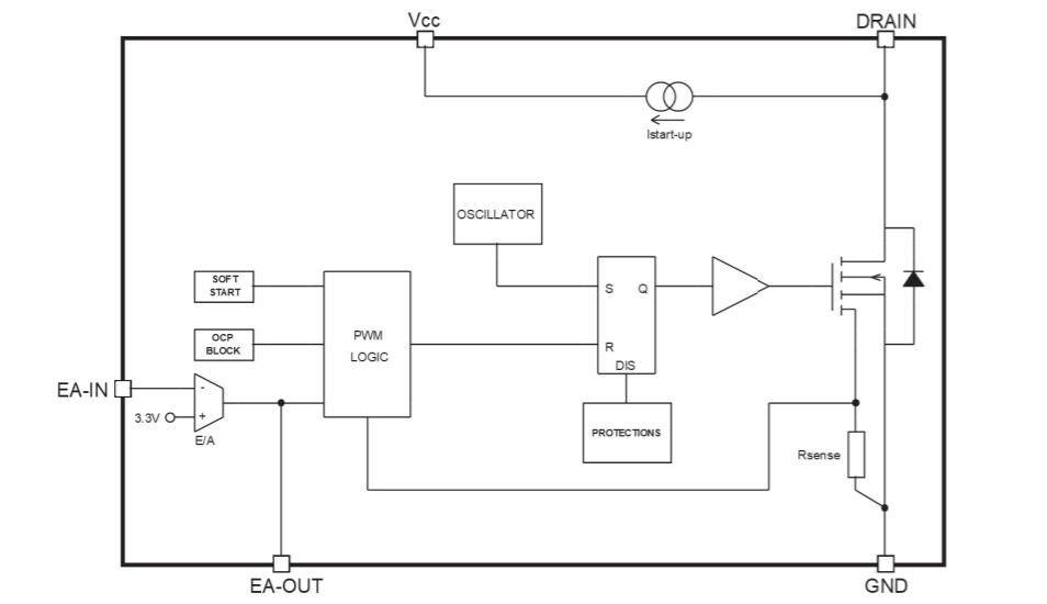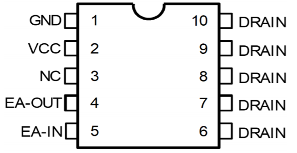 VIPer122系列器件采用10引腳的封裝方式,包括:1個GND、1個VCC、1個NC、1個EA-OUT、1個EA-IN和5個DRAIN。其中,內(nèi)置高壓開關(guān)啟動偏置電流來自DRAIN。